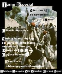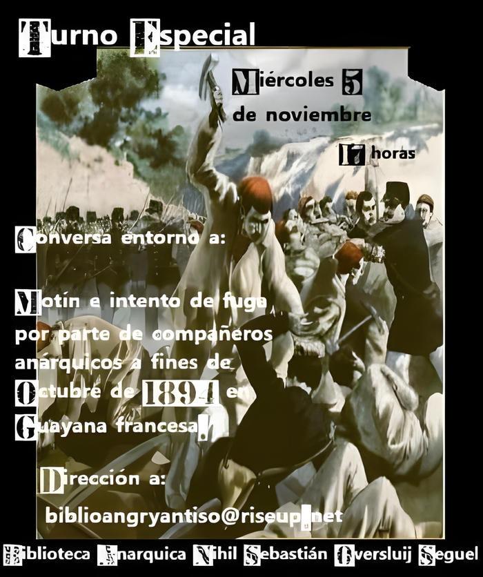 Nuevamente les invitamos a un «Turno Especial». En esta ocasión la intención es conversar, reflexionar, tensionar en torno a los hechos que sucedieron hace más de 100 años en el territorio dominado y colonizado por Francia en el noreste de abya yala sur, las Guayanas Francesas. En esta ocasión un grupo de compañeros anárquicos fueron asesinados en un motín e intento de fuga en ese territorio utilizado por Francia como cárcel, ya que su densa selva frente al Océano Atlántico era un lugar indómito donde fueron llevado más de 80.000 personas de los cuales muchos fueron compañeros anárquicos.