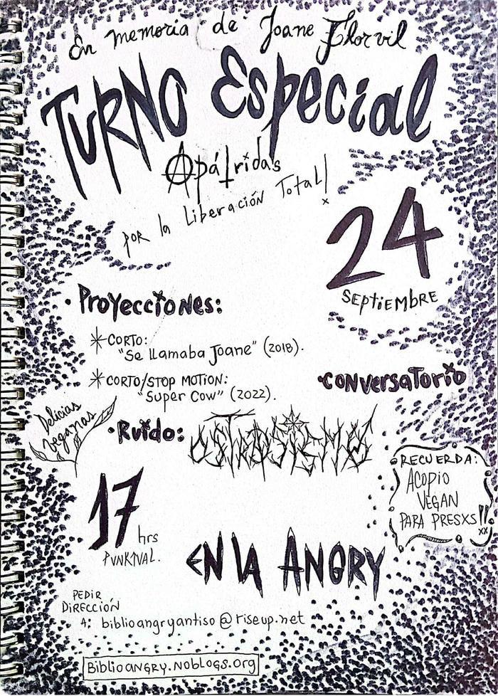 Esto será en la Biblioteca Anárquica Sebastián Oversluij Seguel, pedir dirección a: biblioangryantiso@riseup.net